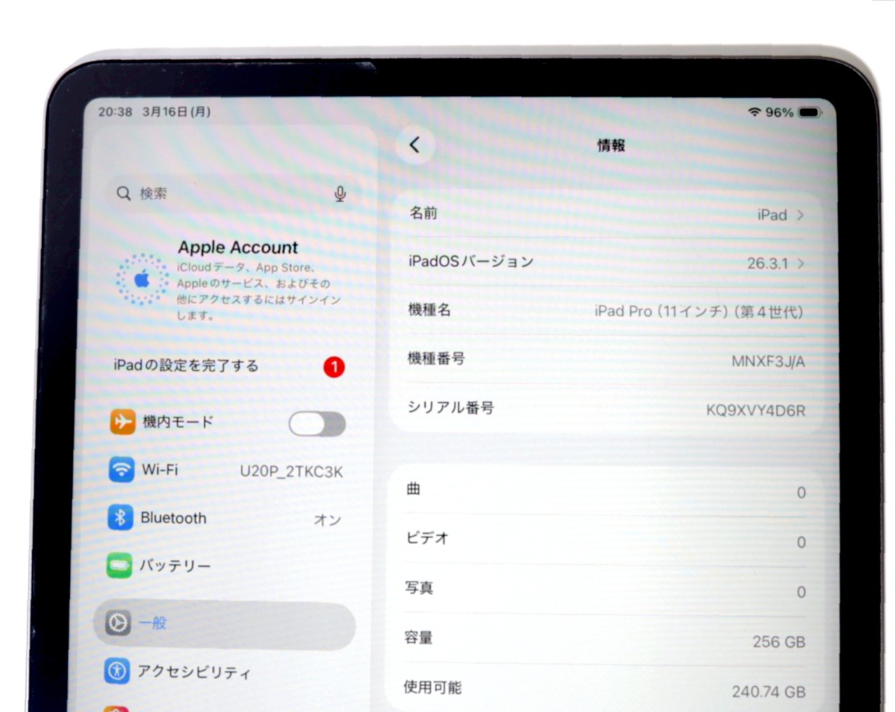 APPLE [USED]u060451 iPad Pro11インチ 第4世代 Wi-Fi 256GB 2022年秋モデル MNXF3J/A [スペースグレイ] の 商品仕様1: