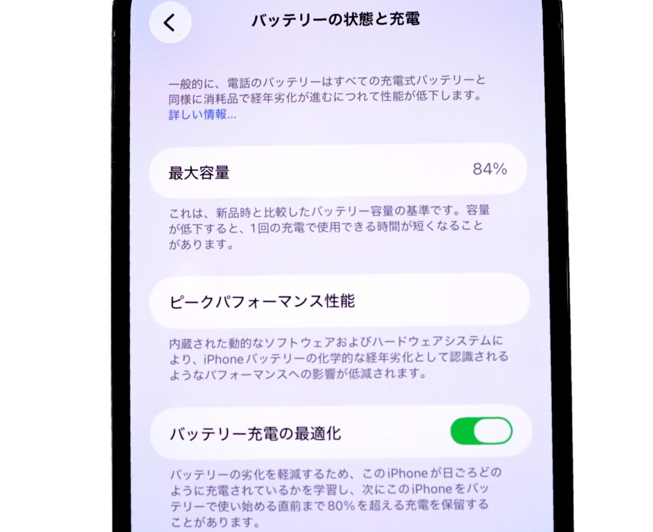 バッテリー最大容量=84%です。