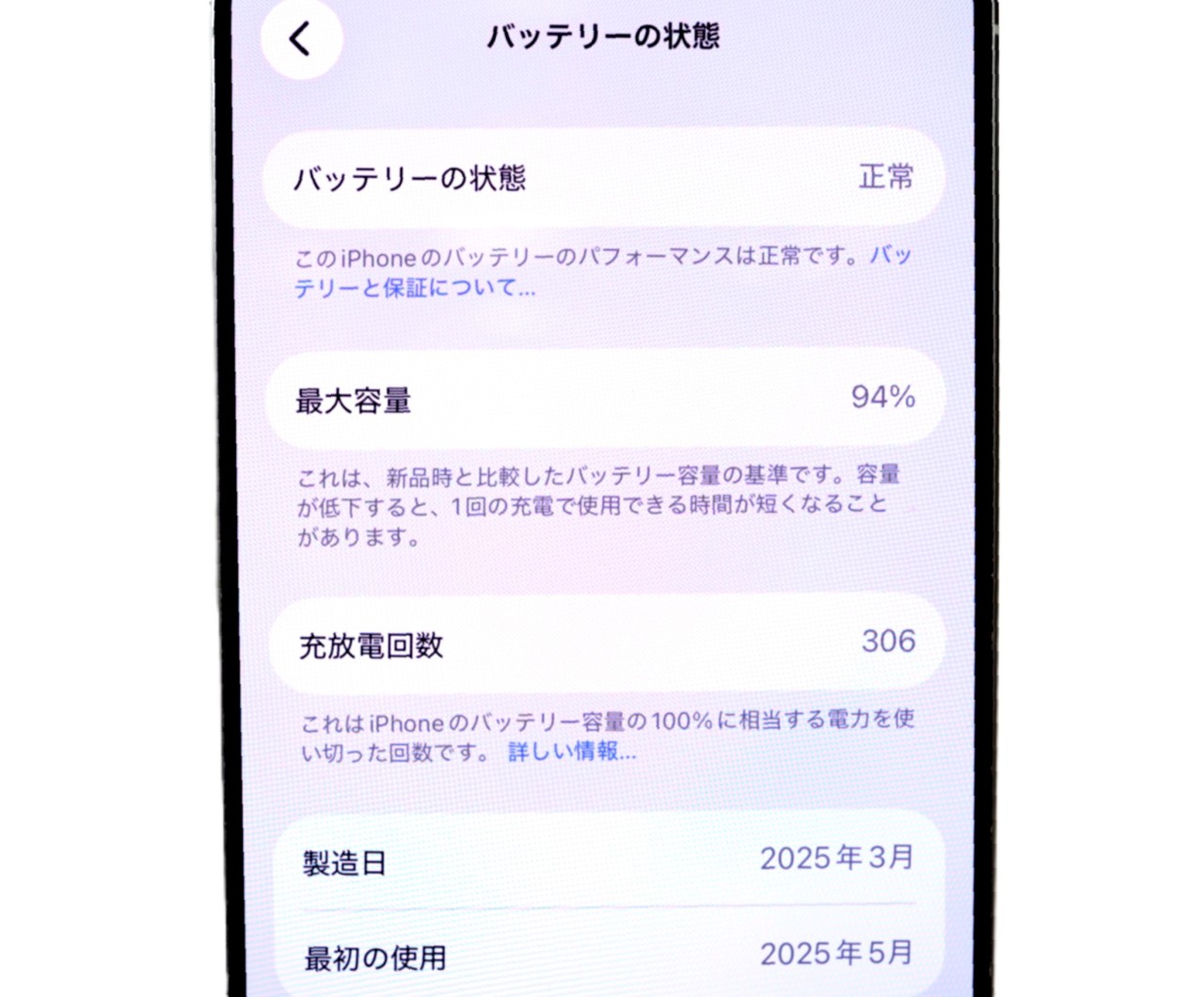 バッテリー最大容量=94%です。