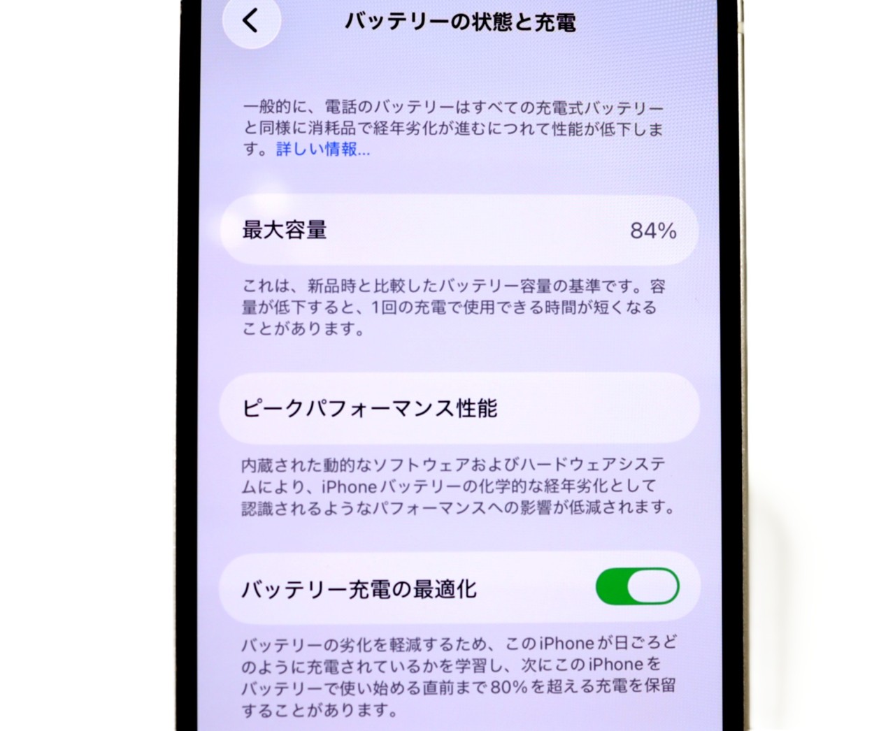 バッテリー最大容量=84%です。