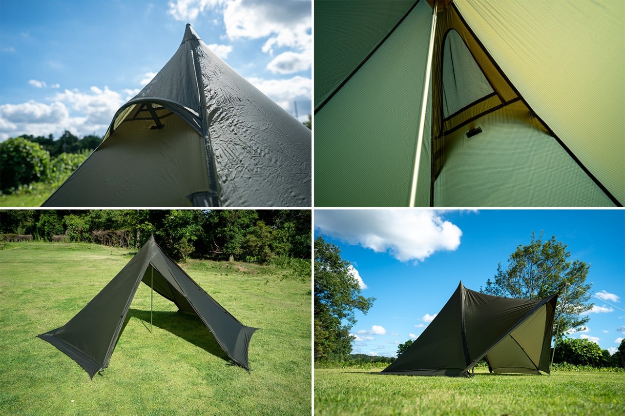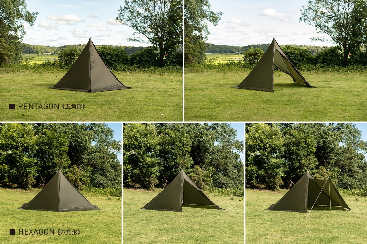 タッソの変形機能を受け継ぐ、リップストップ採用の超軽量モノポール フライとポールの総重量は1.2kg 五角形、六角形で使用できます バックパッカーやソロキャンパーにおすすめ