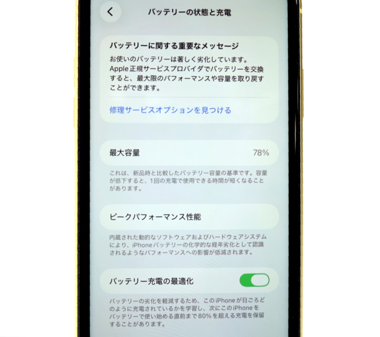 バッテリー最大容量=78% バッテリー劣化が進んでおります。