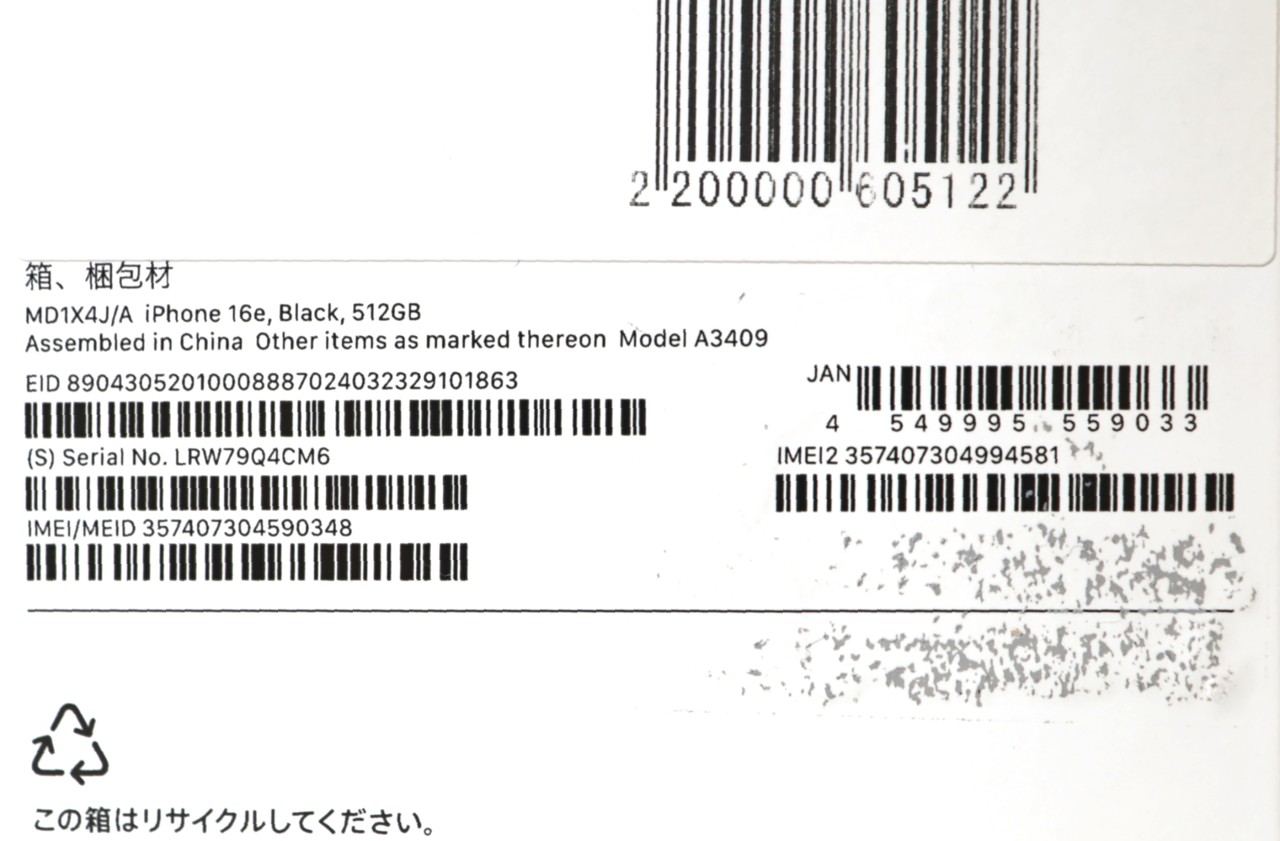 APPLE [USED]u060512 iPhone16e 512GB SIMフリー [ブラック] の 商品仕様1: