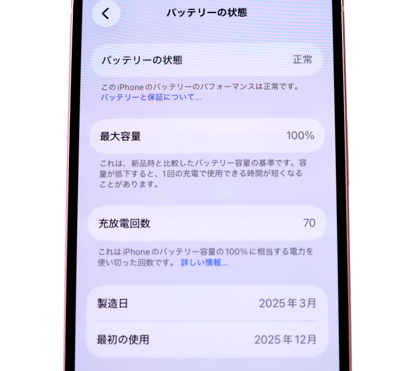 バッテリー最大容量=100% 充放電回数=70回