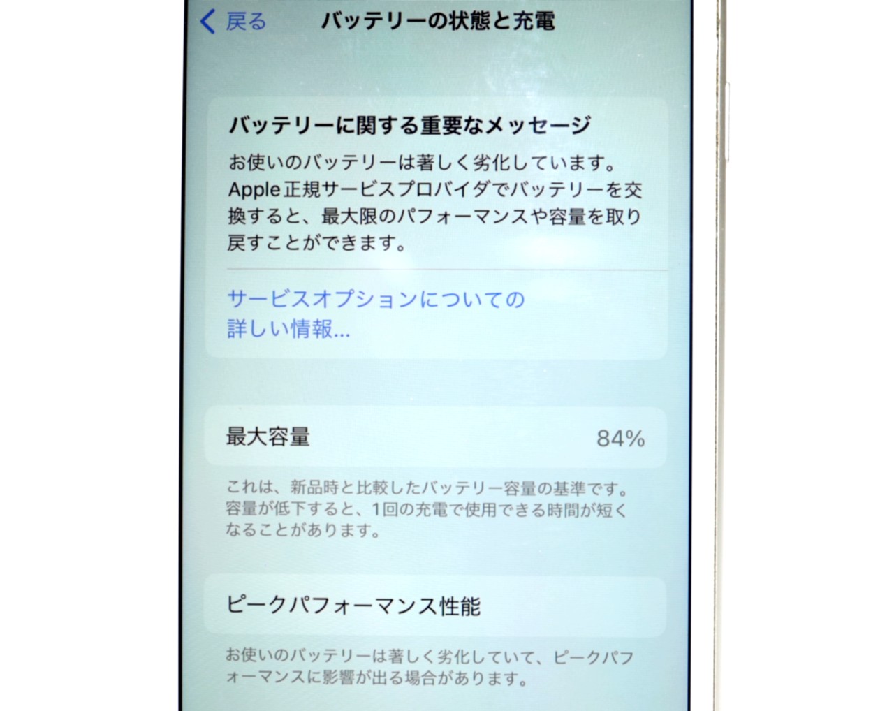 バッテリー最大容量=84% バッテリー交換推奨表示が出ます。