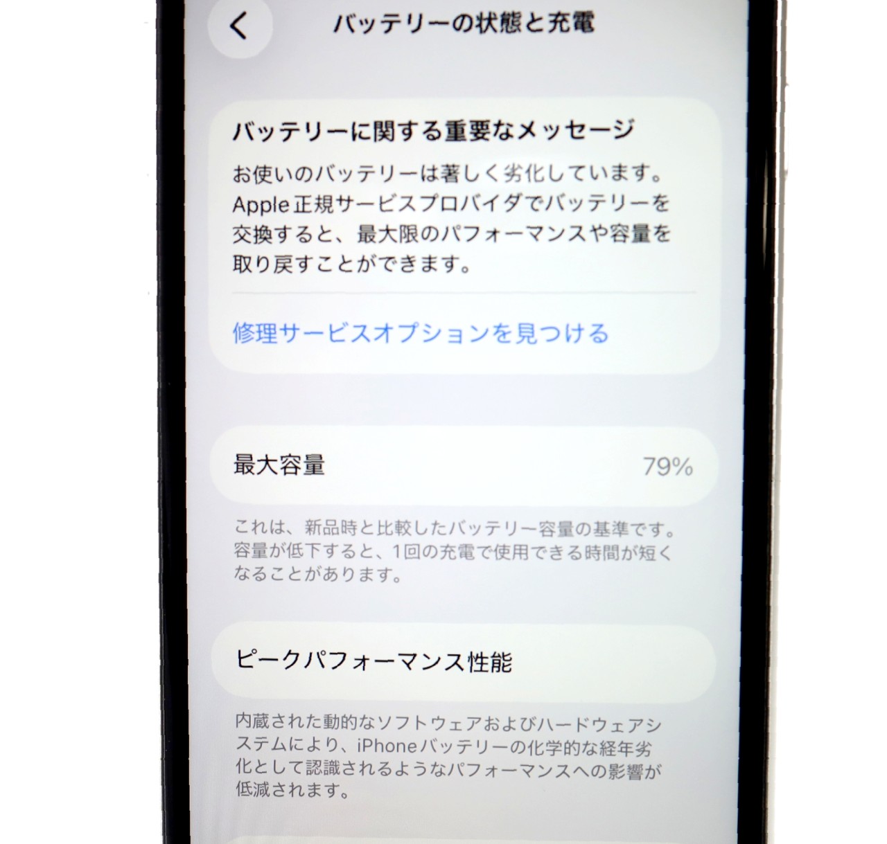 バッテリー最大容量=79% バッテリー劣化が進んでおります。