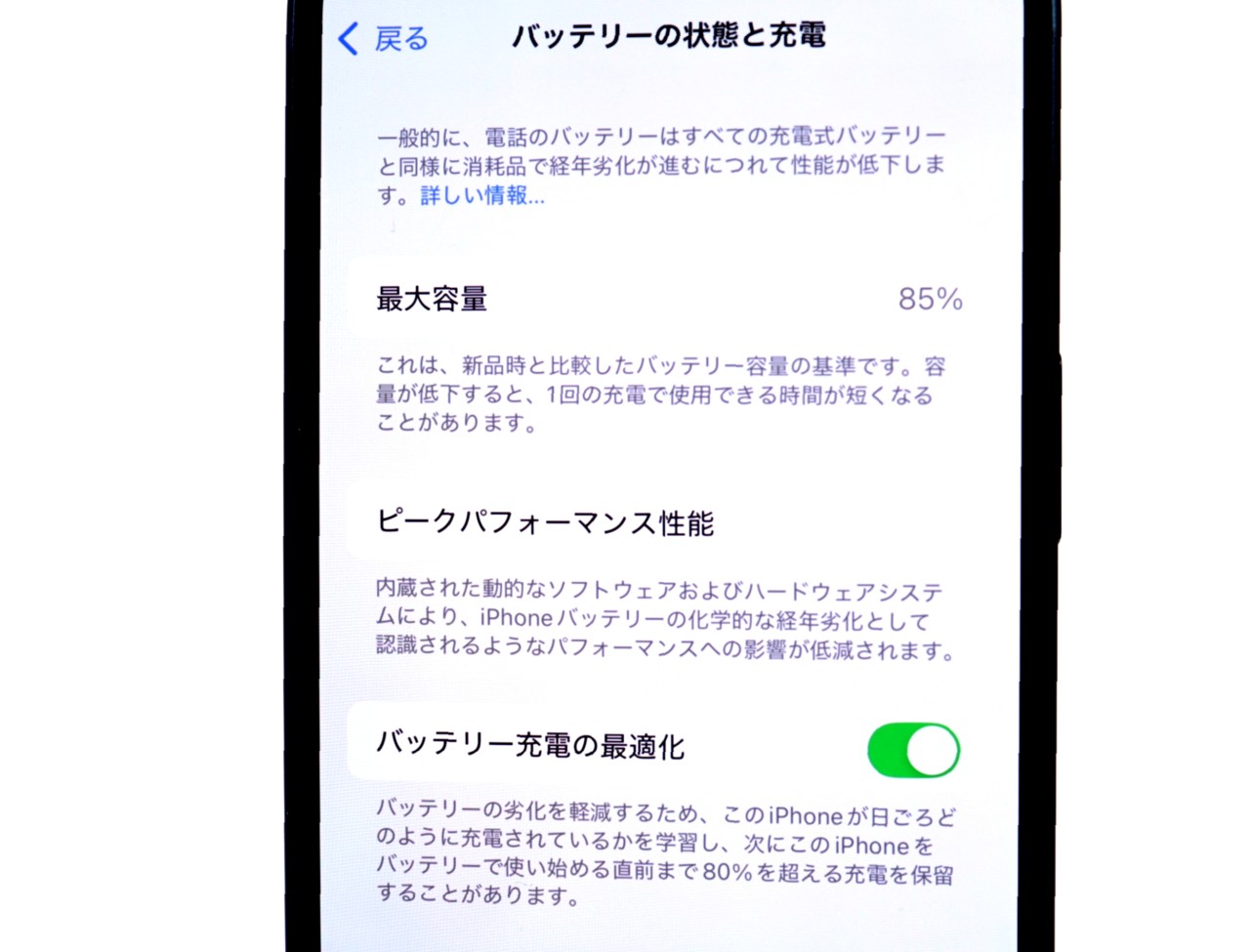 バッテリー最大容量=85%