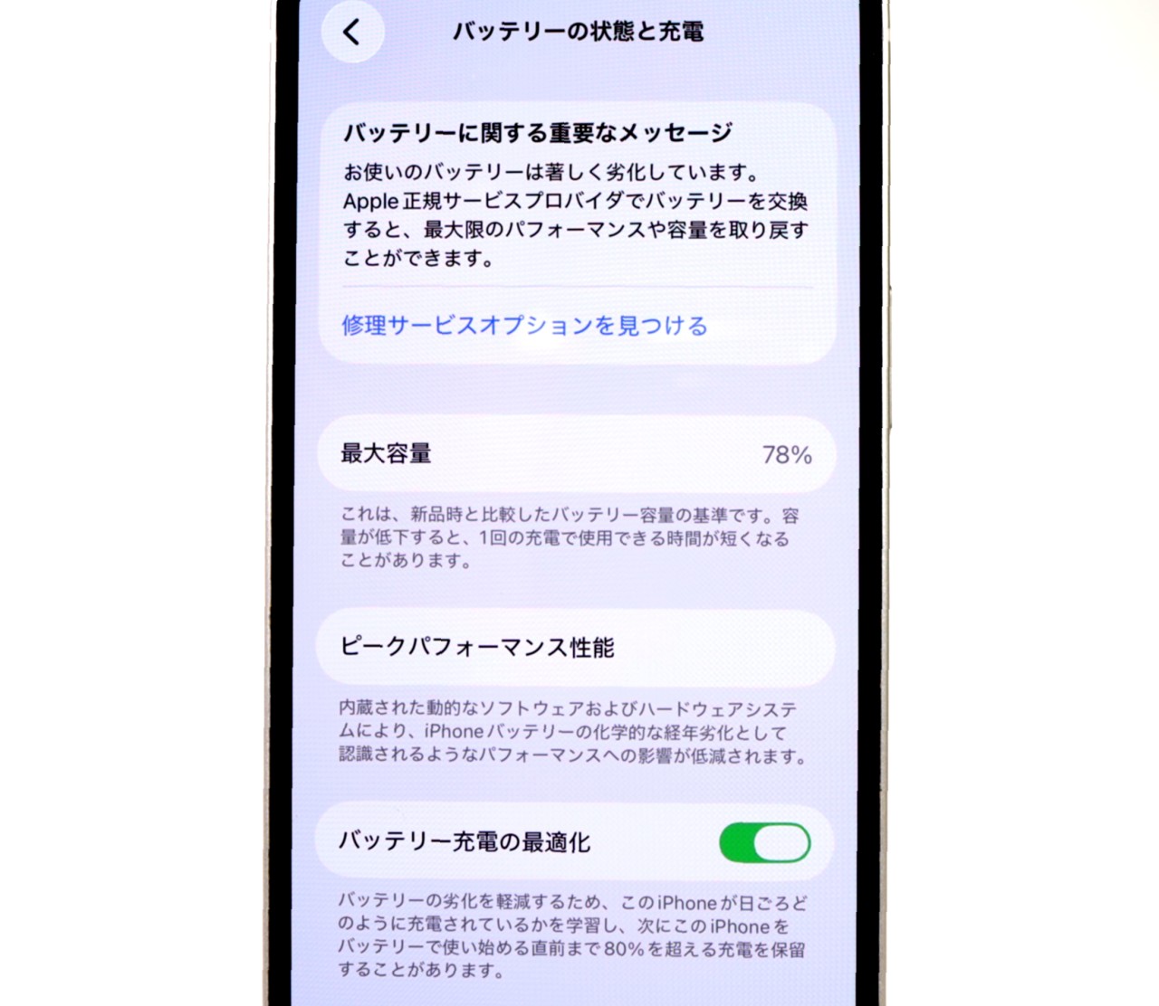 バッテリー最大容量=78% バッテリー劣化が進んでおります。