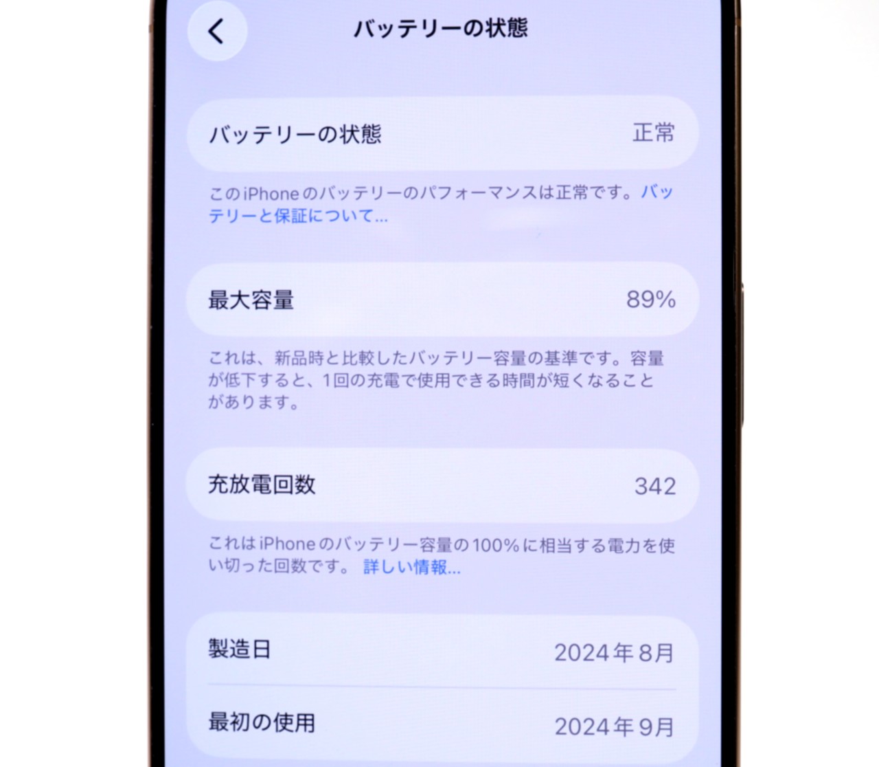 バッテリー最大容量=89% MEIチェック=各キャリア【-】