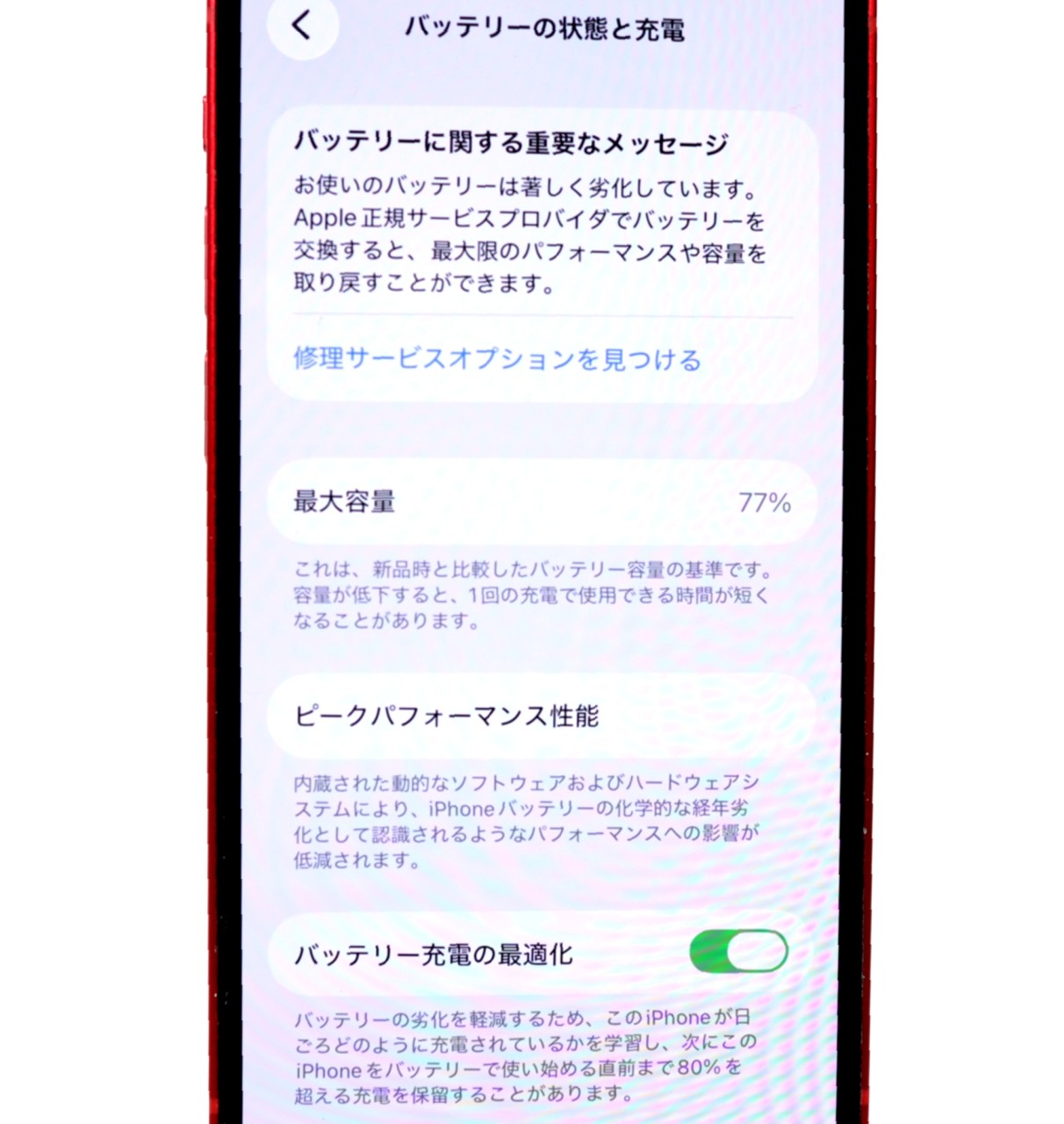 バッテリー最大容量=77% ※バッテリー劣化が進んでおります。