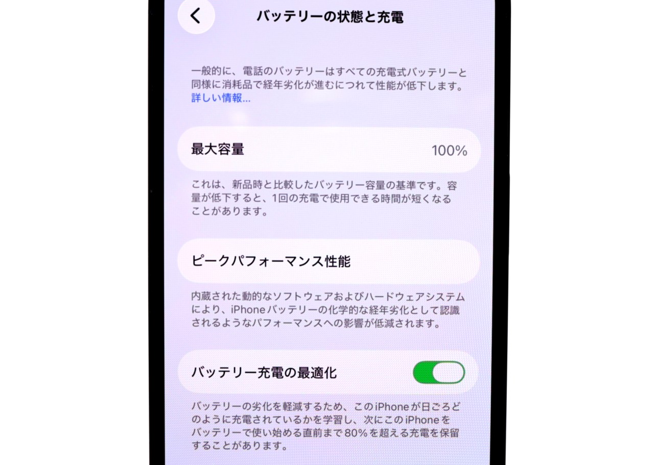 バッテリー最大容量表示=100%です。目立ちませんが、側面に細かな傷がございます。