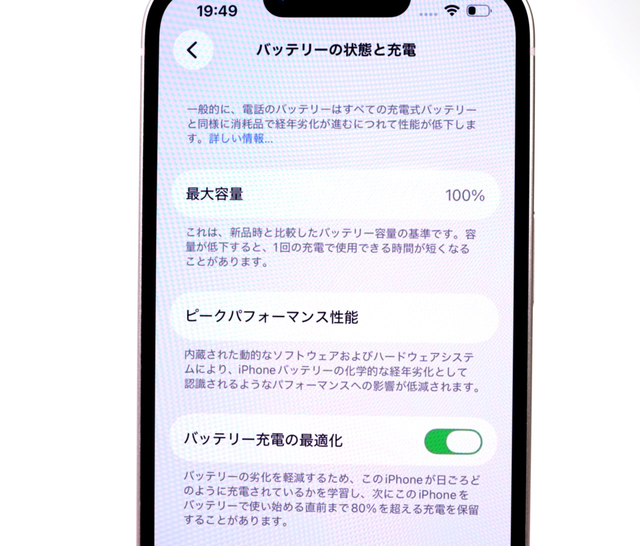 バッテリー最大容量表示=100%です。使用感が少なく非常にきれいな状態です。